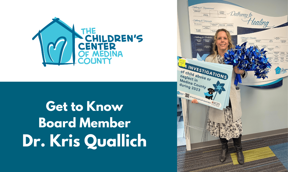This month we are spotlighting the President of the Board of Directors, Dr. Kris Quallich. Kris joined the Board of Directors in 2018. She served as the Vice President from 2020-2022 and the President from 2022-2024. Kris has been an outstanding advocate for The Children’s Center in the Medina County Schools. She was instrumental in reinstating Human Trafficking Awareness and Safe Relationship training and bringing the recent Sextortion training to Medina County. Kris strongly promoted awareness of Child Abuse Prevention advocating for the Medina City School’s participation in the Pinwheel Gardens Project. She has played an important role in community outreach, education, and fundraising for The Children’s Center.
